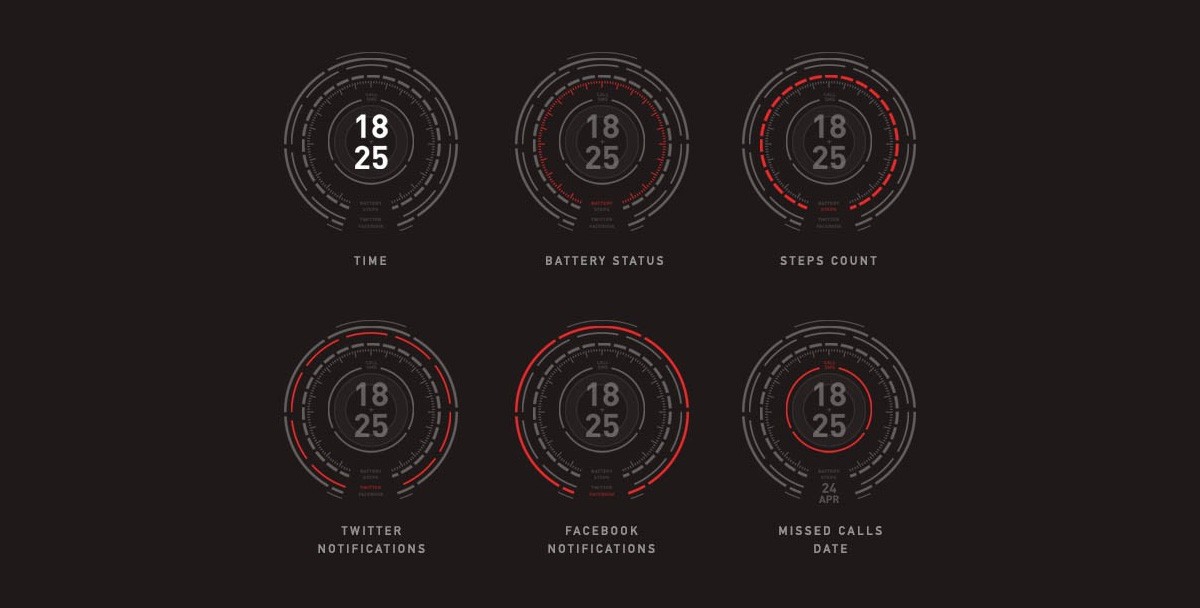Circles color informs about notifications, missed calls and steps during the day. Legend part switches to date stamp after a tap. The most important is of course the current time.